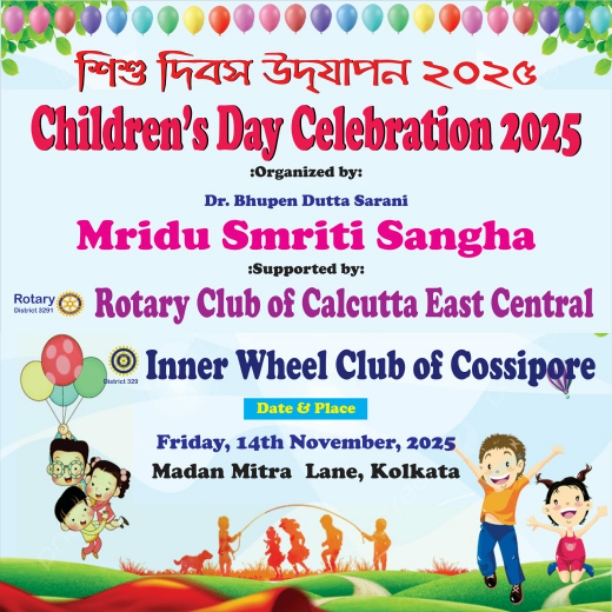 LIKE EVERY YEAR RC CALCUTTA EAST CENTRAL WILL ORGANISE CHILDREN'S DAY CELEBRATION PROGRAMME JOINTLY WITH DR. BHUPEN DUTTA SARANI MRIDU SMRITI SANGHA AND INNER WHEEL CLUB OF COSSIPORE ON FRIDAY 14TH NOVEMBER 2025 AT MADAN MITRA LANE, KOLKATA -700006 FROM 11 AM ONWARDS. WE ARE JOINTLY GOING TO PROVIDE TIFFIN PACKETS, SITTING LUNCH AND SCHOOL BAGS WITH EDUCATIONAL KITS TO 110 NOS OF UNDERPRIVILEGED PRIMARY STUDENTS, 60 NOS STUDENTS OF AANGAN BADI & 50 NOS STUDENTS OF VIVEKANANDA ANCESTRAL HOUSE & CULTURAL CENTRE.